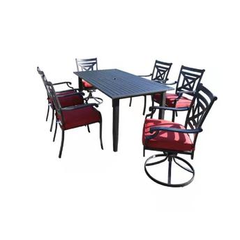 • طقم سفرة خارجي يتسع لـ 6 مقاعد يتضمن 2 ×كرسي هزاز دوار و 4 ×كراسي عادية و 1 × طاولة مستطيلة
