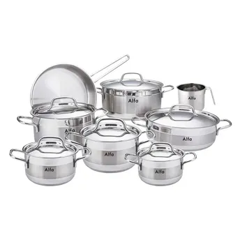 - طقم أواني طهي ستانلس ستيل ألفا (فضي، 30 سم، 14 قطعة) يشمل وعاء حليب سعة 14 سم، وأواني طهي سعة 16 سم، و18 سم، و22 سم، و26 سم، و30 سم مع أغطية، وقدر طهي منخفض سعة 26 سم مع غطاء، ومقلاة سعة 24 سم.