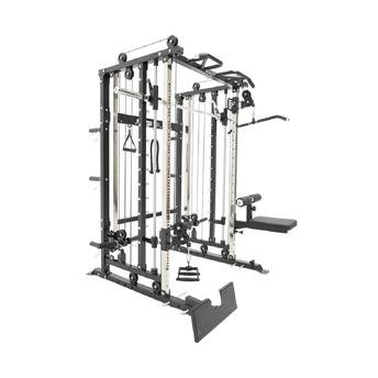 - خمس آلات في جهاز واحد! إنها آلة الكل في واحد تجمع بين جميع مزايا رف تمارين القوة، والجهاز الرياضي العملي، وآلة سميث ، وعمود تمرين العقلة تشين أب، وجهاز تمارين الكور للعضلات الأساسية.