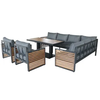 - طقم كنب خارجي زاوية ألومنيوم 9 مقاعد مع وسائد أوسلو (135 × 70 × 74 سم) عبارة عن طقم جلوس خارجي عصري وواسع يتضمن أرائك أو كنب وطاولة قابلة للرفع لاستخدامات متعددة.