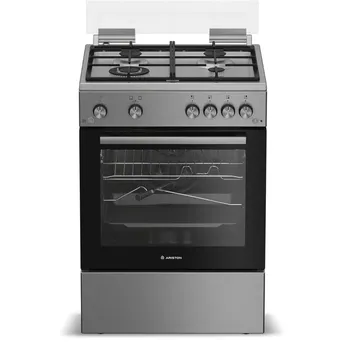 - The Ariston 4-Burner Freestanding Gas Cooker W/Oven, ARR6GGG23125XME (60 x 60 x 85 cm) features three gas burners and one wok burner with cast iron pan supports.