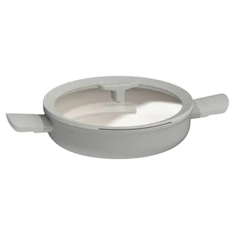 - The Berghoff Balance Aluminum Saute Pan (Moonmist, 26 cm) handles easily with its lightweight material.
