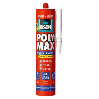 - The Bison Poly Max High Tack Express Silicone Tube bonds materials like glass, stone, concrete, wood, and metal.