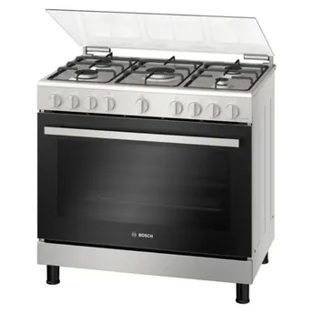 - The Bosch Series 4 Freestanding 5-Burner Gas Cooker, HGV1ISW50M (60 x 90 x 85 cm) delivers 147 liters of maximum space with its XXL cavity.