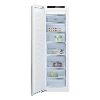 - The Bosch Series 6 Built-In Upright Freezer, GIN81AEE0M (235 L) adapts to temperature changes with VarioInverter for optimal performance during voltage fluctuations.