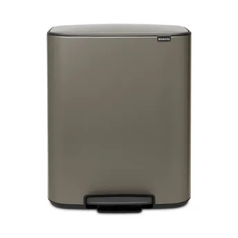 - The Brabantia Stainless Steel Bo Pedal Bin (36.3 x 54.1 x 65.2 cm, 60 L, Platinum) operates hygienically with a smooth, soft-closing lid activated by light pedal pressure.