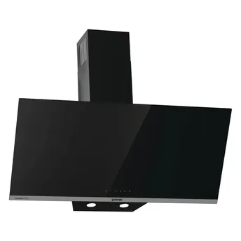 - The Gorenje Built-In Inclined Glass Cooker Hood, WHI944EB (89.5 x 41.1 x 35.8 cm) mounts on the wall with air extraction vents or recirculation.