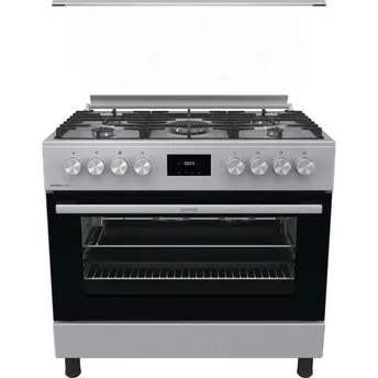- The Gorenje Freestanding 5-Burner Gas Cooker W/Electric Oven, GK9C40X (90 x 60 cm) featuring stainless steel finish with glass door and cover material with ergonomic knobs.