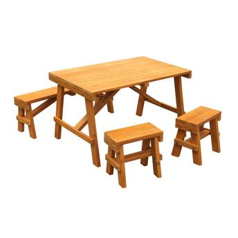 - Quality, long-lasting hardware. Includes 1 long bench and 2 small benches. Child-friendly water-based stain.