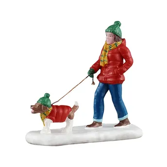 - The Lemax A Snowy Walk Festive Decor (Multicolor) depicts a woman enjoying a snowy stroll with her playful pup, creating a heart-warming winter scene full of cozy vibes.