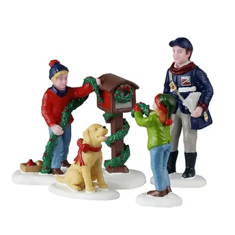 - The Lemax Mailbox Festive Decor Set (Multicolor, 4 Pc.) features cheerful figurine set of a mom, daughter, playful pup, and postman spreading festive joy with holiday mail.
