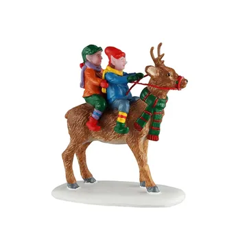 - The Lemax Reindeer Rides Festive Decor (Multicolor) features joyful couple riding a majestic reindeer through Santa’s Wonderland, surrounded by twinkling lights and snowy trees.