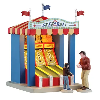 - The Lemax Skee Ball Game Battery-Operated Festive Decor Set (Multicolor, 4.5 V, 3 Pc.) features a father and son enjoying a skee ball game together, capturing laughter, excitement, and festive family fun.