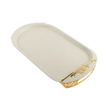 - The Otantik Liqaa Metal Serving Tray (Beige & Gold) displays a durable and elegant metal construction.