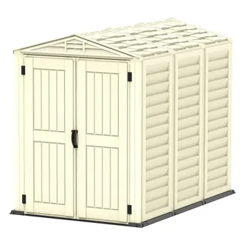 - The Duramax Aluminium & Vinyl Plastic Storage Shed (Ivory, 250 x 161 x 210 cm) features sturdy and spacious storage solution that lets you maximize your outdoor space.