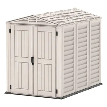 - The Duramax Aluminium & Vinyl Plastic Storage Shed (Adobe, 250 x 161 x 210 cm) features sturdy and spacious storage solution that lets you maximize your outdoor space.