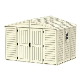 - The Duramax Aluminium & Vinyl Plastic Storage Shed (Ivory, 325 x 247 x 233 cm) features a spacious interior with plenty of room for gardening tools and outdoor equipment.