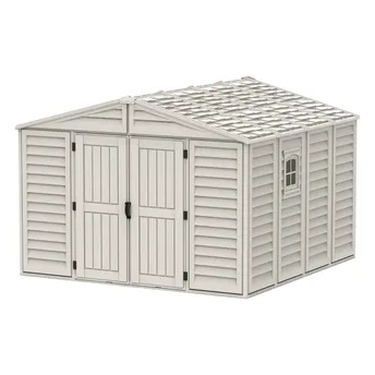 • The Duramax Aluminium & Vinyl Plastic Storage Shed (Adobe, 326 x 325 x 233 cm) features a spacious interior with plenty of room for gardening tools and outdoor equipment.