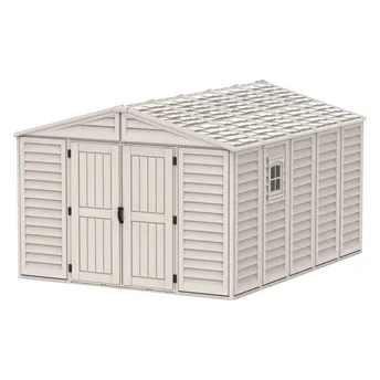 - The Duramax Aluminium & Vinyl Plastic Storage Shed (Adobe, 325 x 405 x 233.2 cm) features a spacious interior with plenty of room for gardening tools and outdoor equipment.