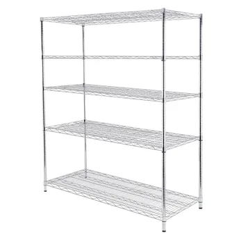 • The Ace 5-Tier Metal Shelf (Chrome, 150 x 60 x 180 cm) provides heavy-duty strength with specific wire and post dimensions.