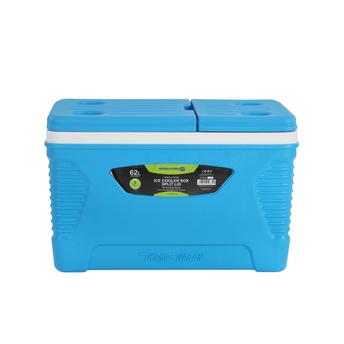 - 62.0 L insulated ice cooler box with attached lid and three-layer thermal insulation.