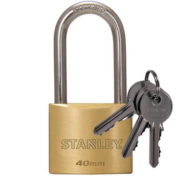 - The Stanley Brass Long Shackle Padlock W/3 Keys at 40 mm has a hardened steel shackle that automatically locks