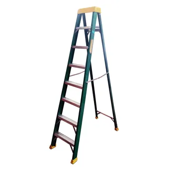 - The Topman Fiberglass Single-Sided 8-Tier Step Ladder (229 x 141 x 58 cm) features heavy-gauge steel hinges for superior strength.