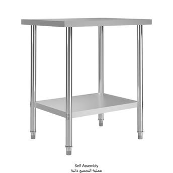 - Color: Silver; Material: Stainless steel; Dimensions: 80 x 60 x 85 cm (L x W x H); Top board size: 80 x 60 cm (L x W); Bottom board size: 68.5 x 48.5 cm (L x W); Weight capacity: 80 kg; Easy to scrub and clean; Adjustable feet; Ideal for kitchen, restaurant, school or other commercial space