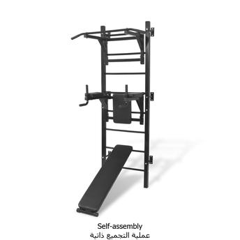 - Color: Black; Material: Steel frame + artificial leather cushions; Overall dimensions: 90 x 130 x 219 cm (W x D x H); Sit-up bench size: 110 x 25 cm (L x W); Maximum user weight: 110 kg; Weight: 36 kg; With a dip station, a pull-up bar and a sit-up bench; Dip station, pull-up bar and sit-up bench are adjustable in height using the hooks; Soft-grip handles; Mounting accessories included; Easy assembly